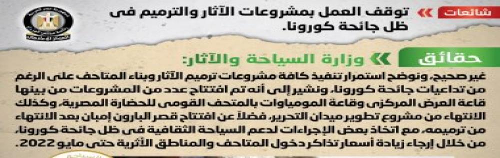 كشف المركز الإعلامى لمجلس الوزراء، إنه فى ضوء ما تردد من أنباء حول توقف العمل بمشروعات الآثار والترميم في ظل جائحة كورونا، تواصل المركز مع وزارة السياحة والآثار، والتي نفت تلك الأنباء، مُؤكدةً أنه لا صحة لتوقف العمل بمشروعات الآثار والترميم في ظل جائحة كورونا، موضحة الاستمرار فى تنفيذ كافة مشروعات ترميم الآثار وبناء المتاحف على الرغم من تداعيات جائحة كورونا.