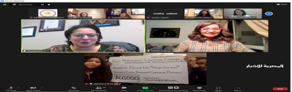 عقدت السفيرة نبيلة مكرم عبد الشهيد وزيرة الدولة للهجرة وشئون المصريين بالخارج، لقاء عبر تطبيق زووم، مع فيبى وصفي مديرة مدرسة فلوباتير، أول مدرسة بإدارة مصرية في أونتاريو بكندا، ومجموعة من طلبة المدرسة تتراوح أعمارهم بين ١٦ و١٧ عام، من الجيلين الثاني والثالث للمصريين بالخارج، لتقديم الشكر لهم على مشاركتهم في دعم المبادرة الرئاسية "حياة كريمة"، من خلال إطلاق حملة تبرعات شارك فيها طلبة المدرسة المصريين، لصالح المشروع القومي لتطوير الريف المصري، بقيمة تبرعات بلغت 80 ألف دولار بما يعادل مليون جنيه مصري.