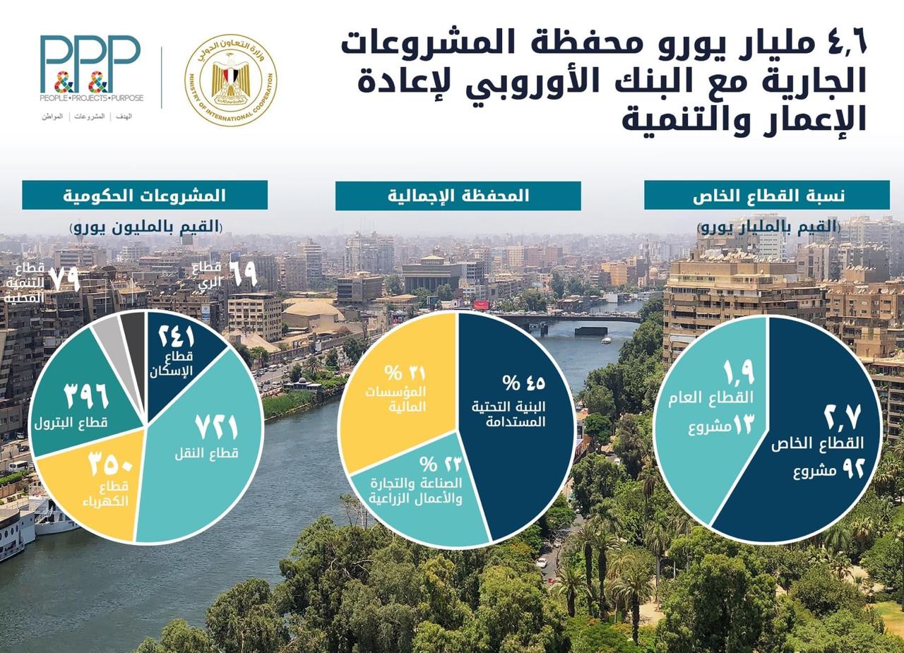 الاستراتيجية الجديدة تتوافق مع الرؤى التنموية المصرية من ناحيتها أكدت الدكتورة رانيا المشاط، وزيرة التعاون الدولي ومحافظ مصر لدى البنك الأوروبي لإعادة الإعمار والتنمية، أن مصر تدعم الاستراتيجية الجديدة التي سيسعى البنك لتنفيذها خلال الفترة من 2021-2025، من أجل تحقيق الاقتصاد الأخضر والتنمية المستدامة، والتي تتوافق مع رؤى الحكومة المصرية التنموية. وأشادت وزيرة التعاون الدولي، بالعلاقات الاستراتيجية مع البنك الأوروبي لإعادة الإعمار والتنمية، موضحة أن استثمارات البنك في العام الماضي سجلت نحو 1.2 مليار يورو في 23 عملية منها 80% للقطاع الخاص، وهو ما يعكس الدور الذي تقوم به وزارة التعاون الدولي للتنسيق مع شركاء التنمية متعددي الأطراف والثنائيين لتعزيز العلاقات الاقتصادية من خلال توفير الدعم والمساندة للقطاع الحكومي والخاص وكذلك المجتمع المدني وأشارت إلى وزيرة التعاون الدولي، لتقرير البنك الأوروبي لإعادة الإعمار والتنمية 2020 الذي قال فيه إن مصر دولة العمليات الوحيدة التي ستحقق نمو بنسبة 2% خلال 2020، و5% في 2021، بسبب مشروعات البنية التحتية وقطاع الاتصالات، وهو ما يعكس نجاح المشروعات القومية التي يتم تنفيذها وبرنامج الإصلاح الاقتصادي في دعم قدرة مصر على امتصاص صدمة كورونا. وتبلغ محفظة المشروعات الجارية للبنك الأوروبي لإعادة الإعمار والتنمية في مصر نحو 4.6 مليار يورو، منها 2.7 مليار يورو للقطاع الخاص في 92 مشروعًا ونحو 1.9 مليار يورو للقطاع الحكومي في 13 مشروعًا، وتتوزع المحفظة الإجمالية بنسبة 45% للبنية التحتية المستدامة و23% للصناعة والتجارة والأعمال الزراعية، و31% للمؤسسات المالية.