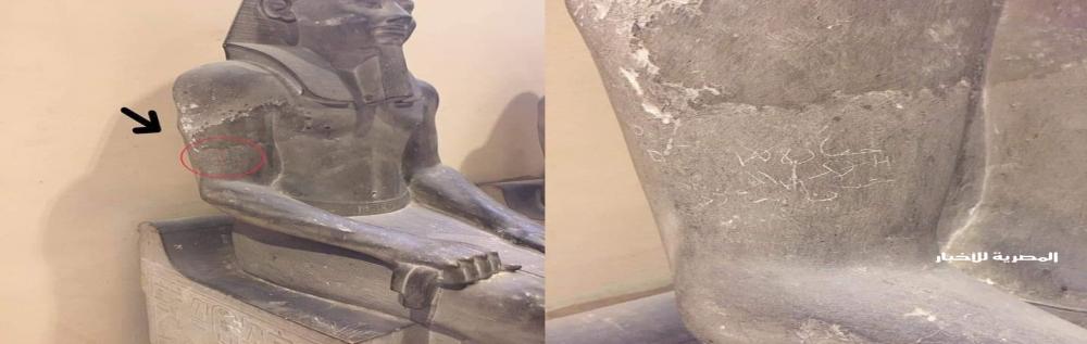 تداول مستخدمو مواقع التواصل الاجتماعي صورا لتمثال فرعوني في متحف مصري، وقد نقش على ذراعه اسما "حمادة" و"حنان"، يتوسطهما قلب اخترقه "سهم الحب".
