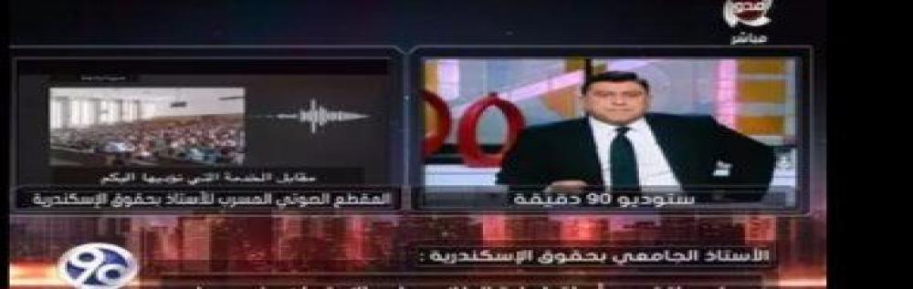 عرض برنامج "90 دقيقة" الذى يقدمه الإعلامى معتز الدمرداش، عبر فضائية "المحور"، مقطعا صوتيا مسربا، لأستاذ بكلية الحقوق فى جامعة الإسكندرية، يتوعد فيه طلاب الدفعة بالرسوب.