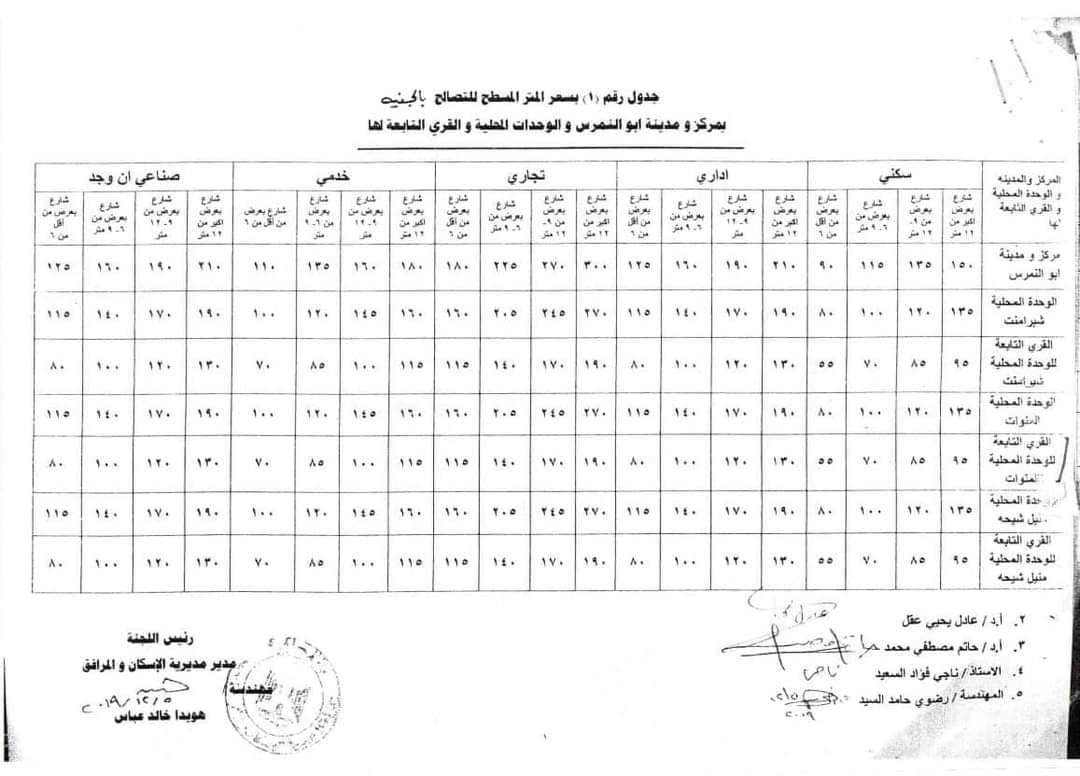 كما أعلنت محافظة الجيزة القيم السعرية للتصالح فى مخالفات البناء بمركز ومدينة أبو النمرس، وكان أصدر محافظ الجيزة قراراً بالقيم السعرية لمناطق (مركز ومدينة أبو النمرس والوحدة المحلية بشبرامنت والقرى التابعة للوحدة المحلية بشبرامنت والوحدة المحلية بالمنوات والقرى التابعة للوحدة المحلية بالمنوات والوحدة المحلية بمنيل شيحة والقرى التابعة للوحدة المحلية بمنيل شيحة)، وذلك للشوارع البالغ مساحتها بعرض أكبر من 12 مترا وبعرض من 9 الى 12 م وبعرض من 6 الى 9 م، وجاءت اقل قيمة فى سعر المتر للتصالح السكنى 55 جنيها وأعلى قيمة للتصالح فى المتر السكنى هى 150 جنيها.