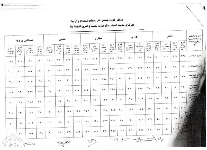 كما نشرت المحافظة القيم السعرية للتصالح فى مخالفات البناء بمركز ومدينة الصف، والخاصة بمناطق ( مركز ومدينة الصف والوحدة المحلية الودى والقرى التابعة لها والوحدة المحلية بالشوبك الشرقي والقرى التابعة لها والوحدة المحلية للأقواز والقرى التابعة لها والوحدة المحلية بغمازة الصغرى والقرى التابعة لها ) وذلك للشوارع البالغ مساحتها بعرض أكبر من 12 مترا وبعرض من 9 الى 12 م وبعرض من 6 إلى 9 م وبعرض أقل من 6 م، حيث جاءت أقل قيمة فى سعر المتر للتصالح السكنى 50 جنيها وأعلى قيمة للتصالح فى المتر السكنى هى 135 جنيها.