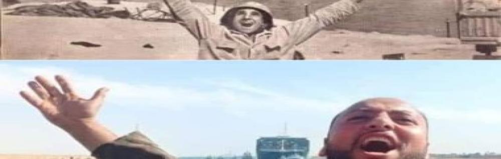 ولتخليد هذا التشابه، دمج المغردون على مواقع التواصل الاجتماعى، الصورتين التى تجمع عامل قناة السويس، والجندى، للتأكيد على صلابة وقوة المصريين فى جميع الأزمات وقدرتهم على النجاح بالعزيمة والإصرار، ورغم مرور قرابة نصف قرن، إلا أن المكان ذاته - وهو ضفاف قناة السويس - كان شاهدًا على لحظات الفرحة والنصر ذاتها.