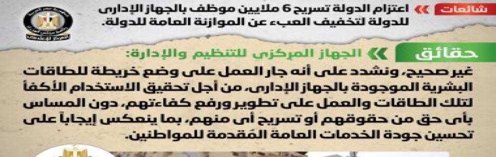 كشف المركز الإعلامى لمجلس الوزراء إنه فى ضوء ما تردد من أنباء بشأن اعتزام الدولة تسريح 6 ملايين موظف بالجهاز الإداري للدولة لتخفيف العبء عن الموازنة العامة للدولة، تواصل المركز مع الجهاز المركزي للتنظيم والإدارة، والذي نفى تلك الأنباء، مُؤكداً أنه لا توجد نية لتسريح أيٍ من موظفي الجهاز الإداري للدولة، مُشدداً على أنه جار العمل على وضع خريطة للطاقات البشرية الموجودة بالجهاز الإداري، من أجل تحقيق الاستخدام الأكفأ لتلك الطاقات والعمل على تطوير ورفع كفاءتهم، دون المساس بأي حق من حقوقهم أو تسريح أي منهم، بما ينعكس إيجاباً على تحسين جودة الخدمات العامة المُقدمة للمواطنين.