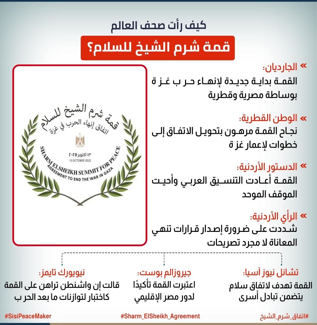 قمة شرم الشيخ.. ردود الأفعال العربية والعالمية تُشيد بدور مصر في تحقيق السلام