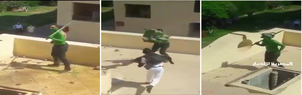 بخطوات حثيثة اقترب أمين شرطة يرتدي سترة واقية من الرصاص "الرجل الأخضر"، حاول السيطرة عليه مستخدمًا عصا غليطًا إلا أن الرد جاء على غير المنشود، حاول الشاب سريع الحركة إصابته بتوجيه ضربات عشوائية بـ"سنجة" مرددًا عبارة "الله اكبر الله أكبر".
