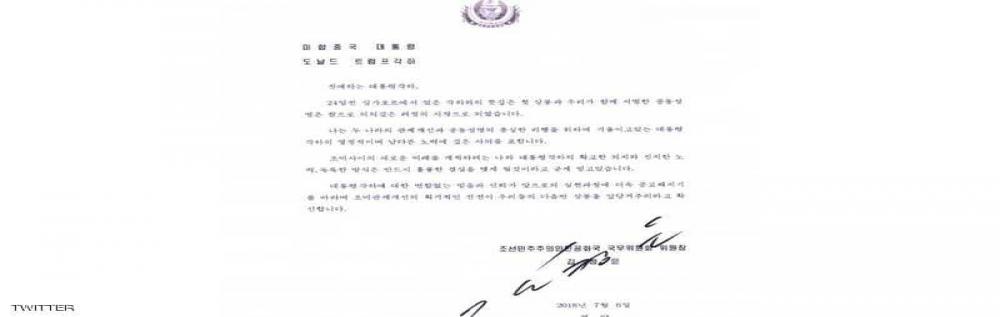 وتحمل الرسالة تاريخ 6 يوليو الجاري، وتتزامن مع زيارة كان يقوم بها وزير الخارجية الأميركي مايك بومبيو إلى عاصمة كوريا الشمالية.