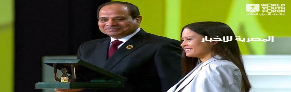 وتفاعل شباب العالم الحاضرون بالتصفيق الحاد والهتاف حين حمل الرئيس السيسي، درع التكريم ل جيسكا