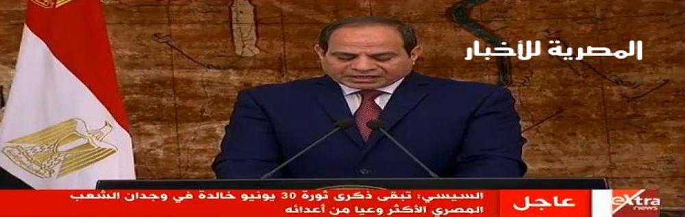 جاء ذلك خلال كلمة الرئيس السيسي للشعب المصري، اليوم الجمعة، بمناسبة الذكرى الرابعة لثورة 30 يونيو.