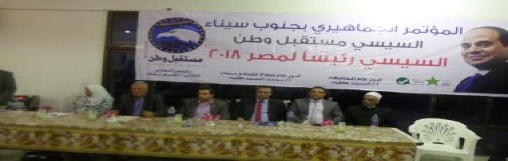 عقدت أمانة حزب مستقبل وطن بجنوب سيناء مؤتمرا جماهيريا لتأييد الرئيس السيسى لفترة رئاسية ثانية وذلك بمركز رأس سدر بمحافظة جنوب سيناء.